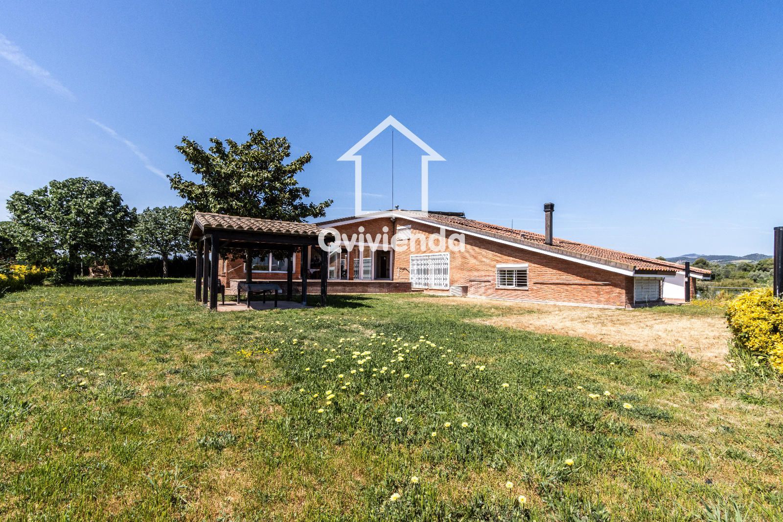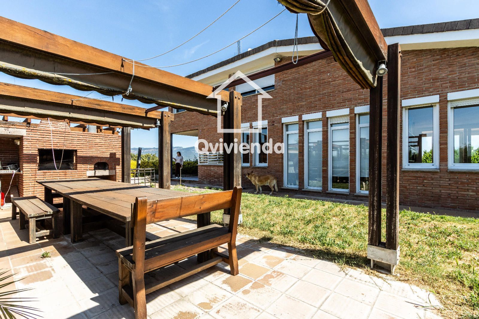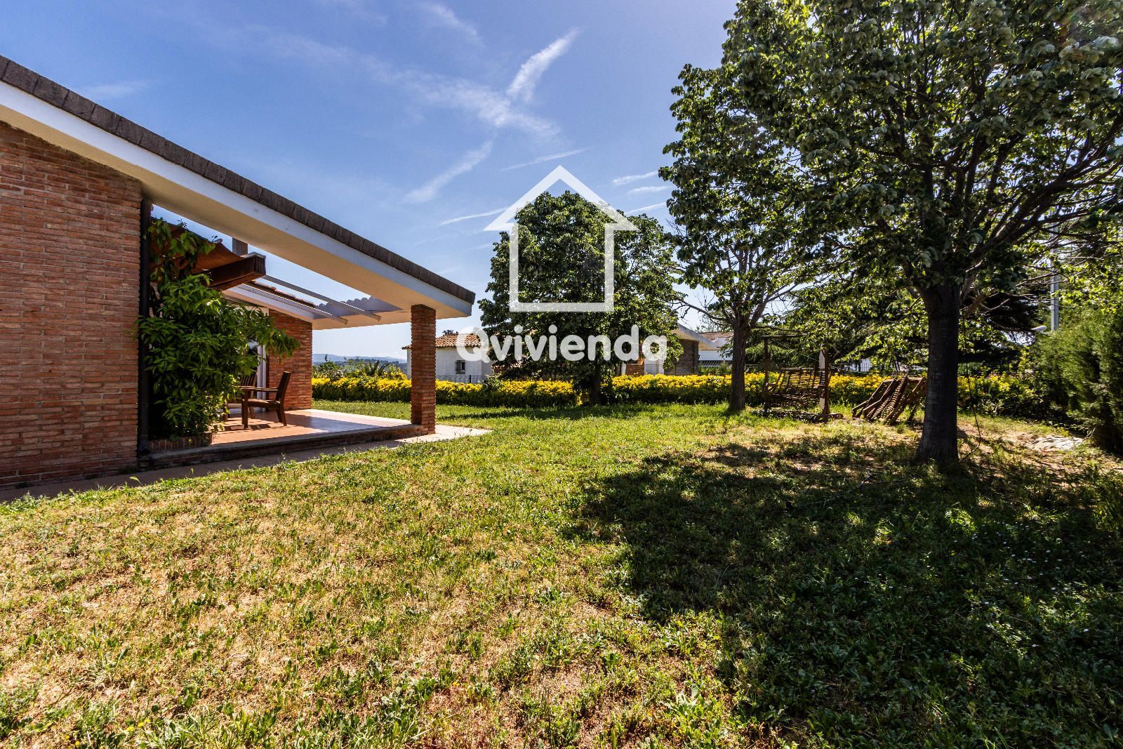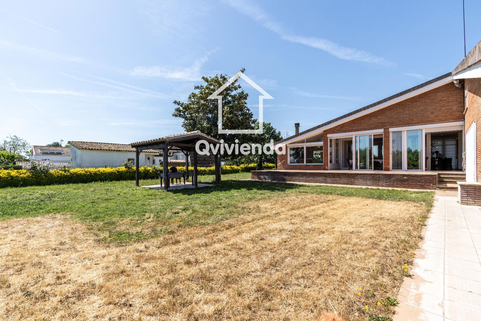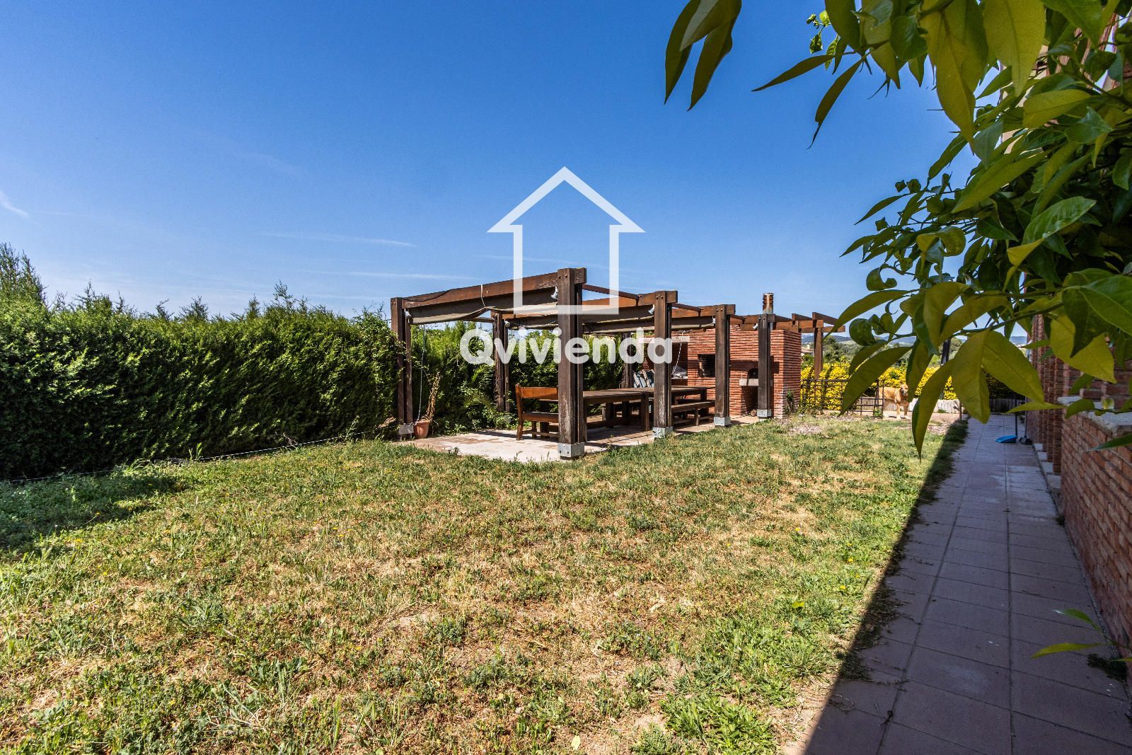 El exterior es simplemente excepcional. Desde el jardín principal, accesible directamente desde la vivienda, se accede a una elegante zona cubierta con celosía de madera, ideal para disfrutar de comidas y cenas al aire libre, acompañada de una gran barbacoa con horno de piedra.