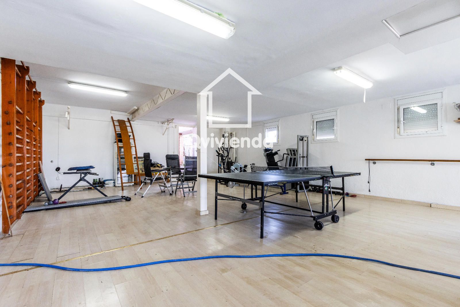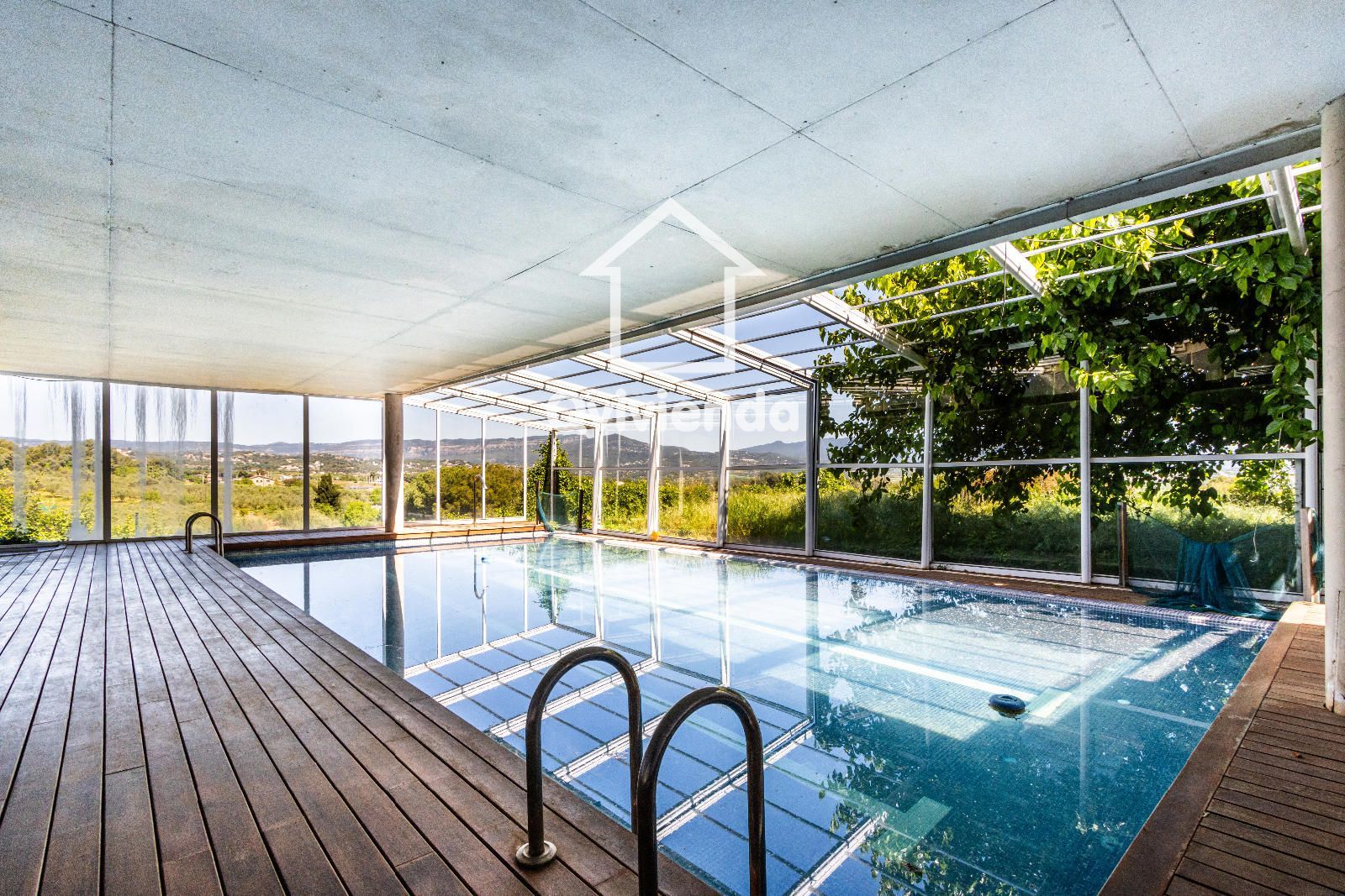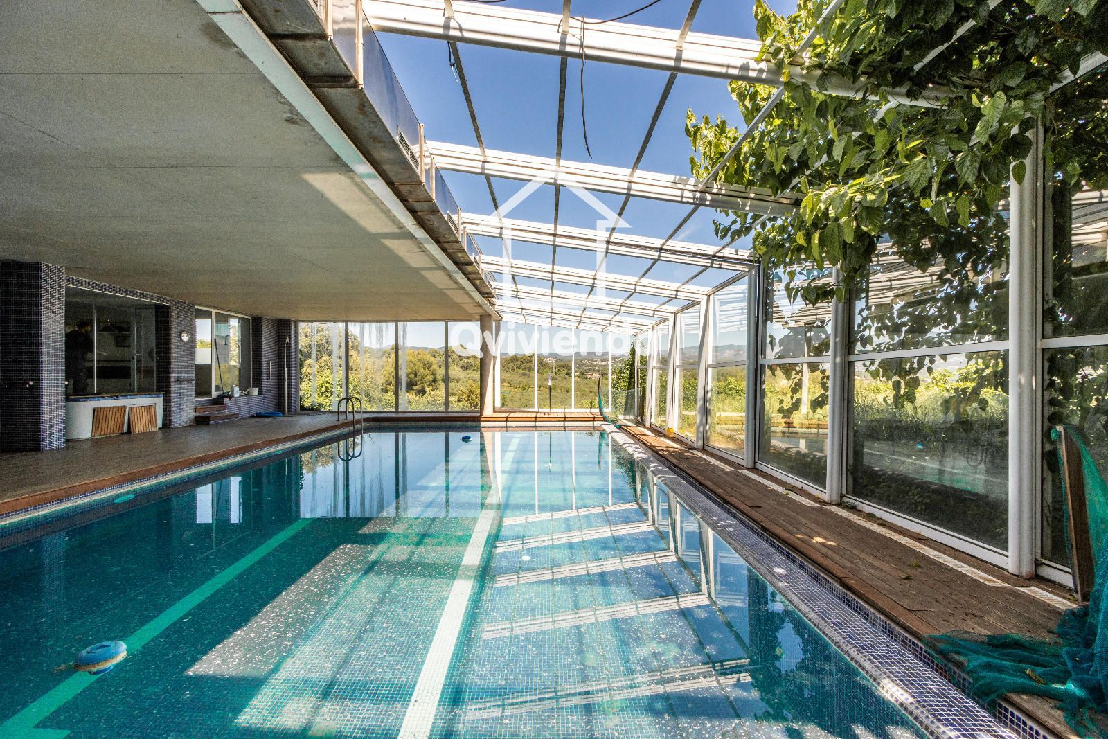 La zona deportiva, conectada cómodamente desde la casa, cuenta con una magnífica piscina, vestuarios, baño, jacuzzi y sauna, creando un auténtico espacio de bienestar. En la parte inferior de la parcela se encuentra una pista de tenis, perfecta para los amantes del deporte.