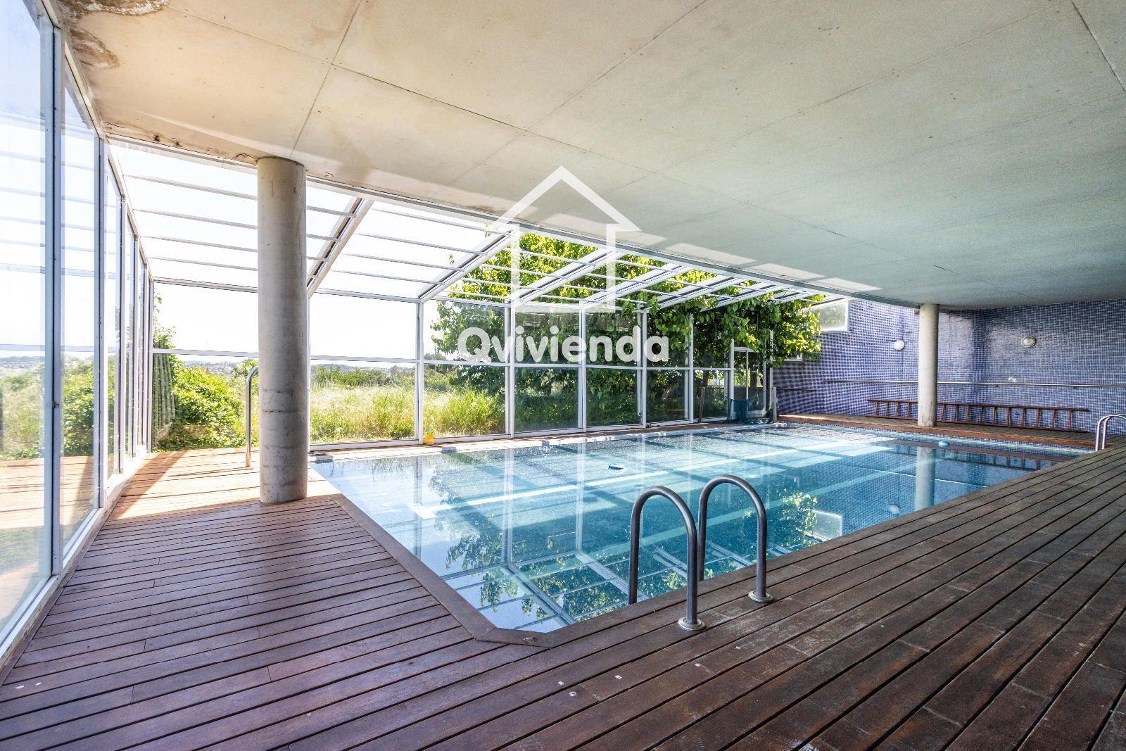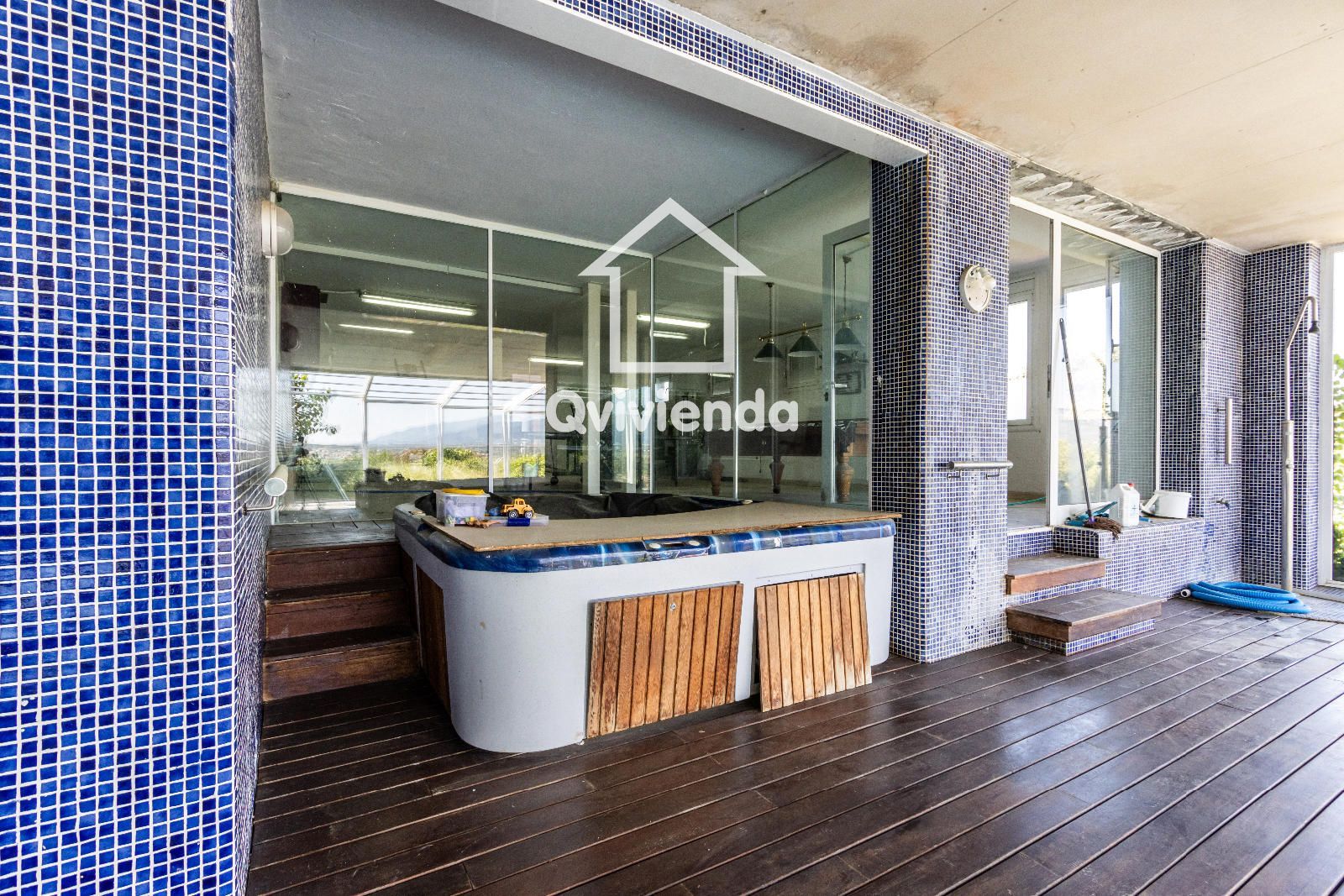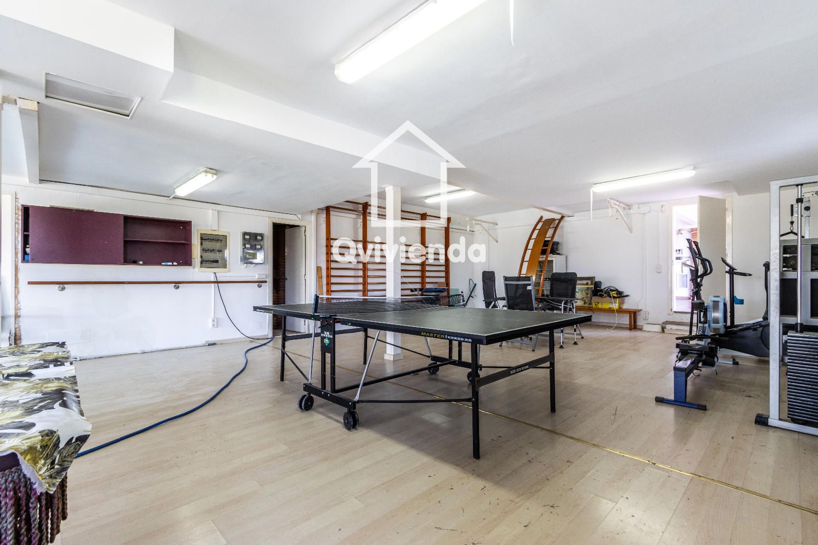 La zona deportiva, conectada cómodamente desde la casa, cuenta con una magnífica piscina, vestuarios, baño, jacuzzi y sauna, creando un auténtico espacio de bienestar. En la parte inferior de la parcela se encuentra una pista de tenis, perfecta para los amantes del deporte.