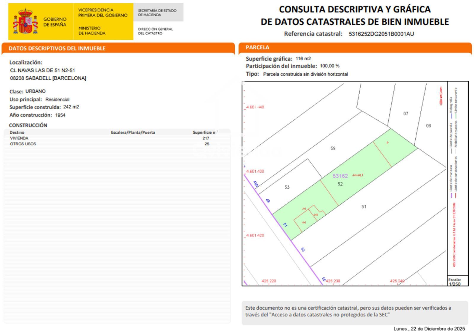 Se trata de un suelo urbano en donde antes existía una casa de puelbo, siendo actualmente el solar de uso residencial en Calle Navas, en el municipio de Sabadell, provincia de Barcelona. Dispone de una superficie de 116 m2. La topografía natural del terreno es con pendiente, con fachada a una calle. Se trata un terreno urbano consolidado. La caracterización urbana, es que se trata de una zona con desarrollo finalizado, con una consolidación de nivel medio alto. Existe pavimentación, alcantarillado, suministro de agua, suministro de luz, existe suministro de gas por red general, dispone de postes de servicio telefónico, alumbrado público, la conservación de la calidad de las infraestructuras colindantes es de nivel medio. Anteriormente existía una edificación de 242 m2 que ha sido derribada.